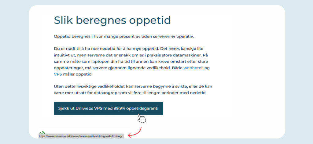 For å sjekke om lenken er trygg eller ikke, kan du holde musepekeren over lenken uten å trykke. Da vil det dukke opp en liten forhåndsvisning, ofte som en boks ved musepekeren, eller nederst i et hjørne på nettleseren din. For å bli kjent med din egen enhet, kan du holde musepekeren over denne knappen, som fører til vår forside. Forhåndsvisningen av denne knappen skal vise https://www.uniweb.no.