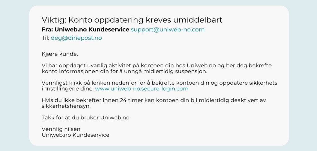 For å illustrere har vi laget et fiktivt eksempel der noen utgir seg for å være fra Uniweb.no, der vi har lagt inn noen typiske phishing-feil. Vi skal igjennom det som for noen er åpenbare røde flagg, mens for andre krever litt trening på å kjenne igjen.