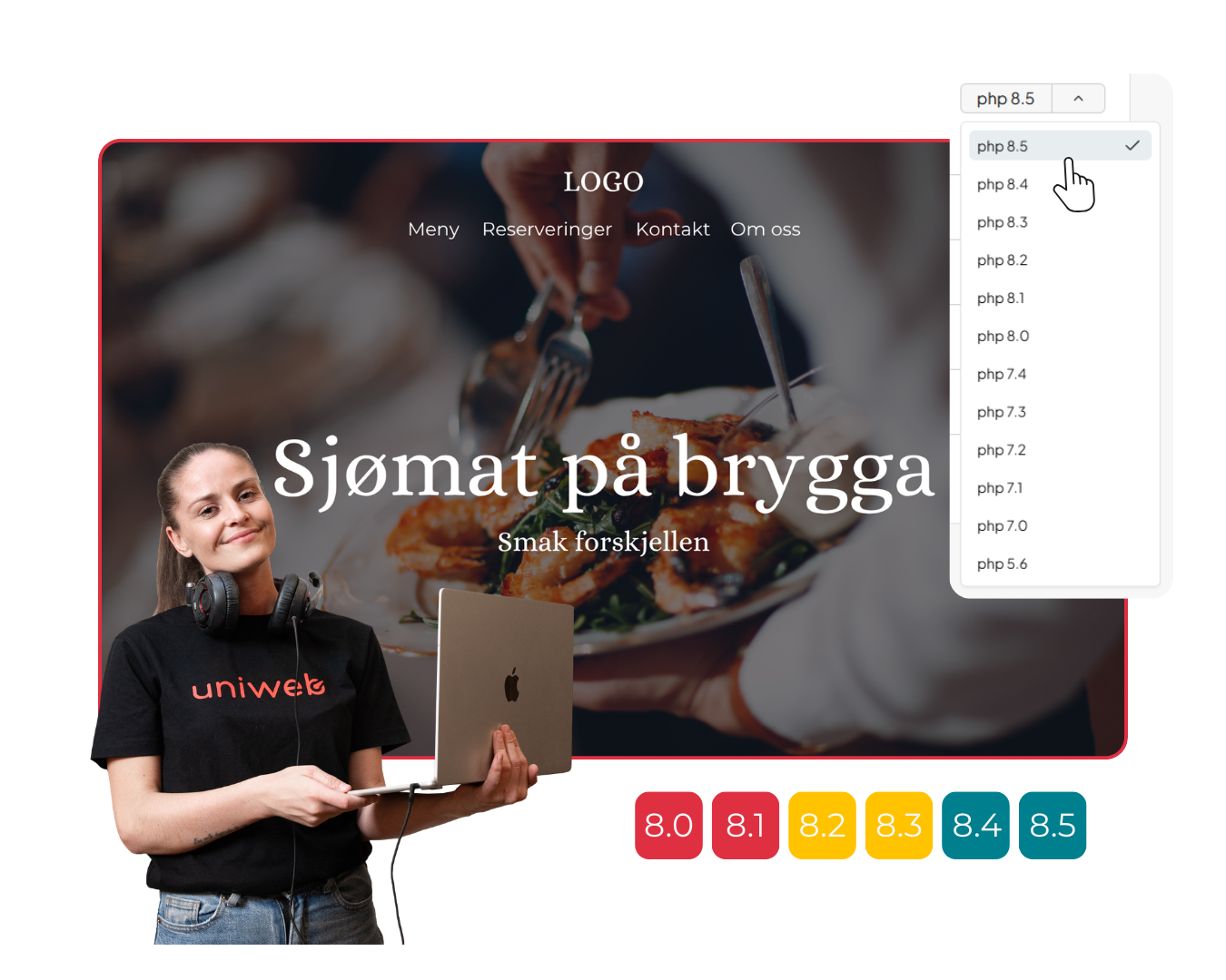 Både nettsiden og webhotellet må ha samme PHP-versjon for å snakke samme språk. Om vi endrer hos oss uten at du oppdaterer i CMSet ditt (for eksempel WordPress), vil du du få feilmeldinger og oppleve nedetid. Dette kan være uheldig for svært mange av våre kunder. Hos Uniweb oppdaterer du derfor PHP selv, så du har full kontroll.